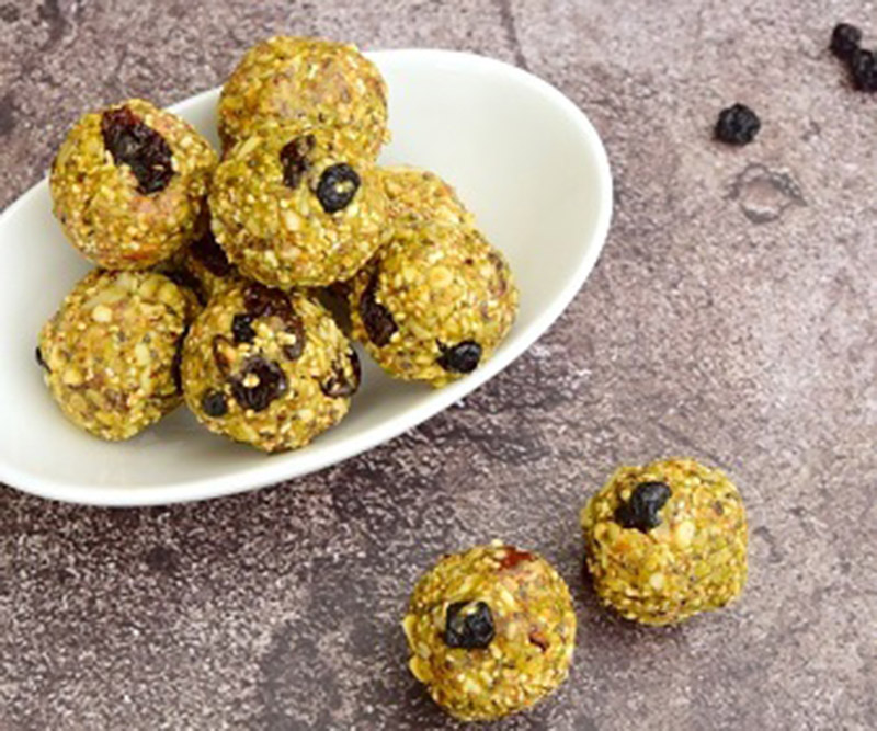 Beat the mid-morning blues with these cheery energy balls, loaded with antioxidant-rich blueberries, cashews and rolled oats. These nutritious ingredients are balanced with dates for a naturally sweet taste without added sugar or sweetener.